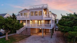From its rooftop balcony, take in breathtaking ocean and canal views that stretch across the horizon, the ideal spot for morning coffee, evening cocktails, or sunset gatherings with friends. Offered fully furnished with minor exclusions, this home is ready for you to start living your best life at the beach from day one. Designed with a reverse floor plan, the main living area is positioned to capture the ocean views you came for. Here, the open layout is framed by picture windows and filled with natural light, creating a warm and inviting space that flows effortlessly for entertaining. The sunroom is a serene spot to enjoy your morning coffee, while the front balcony invites you to listen to the waves as the sun rises over the ocean. Step onto the side balcony and follow the stairway up to the rooftop terrace, your private perch to witness panoramic views that sweep from dazzling sunrises to painted sunsets. Also on the main level are two guest bedrooms, one with a private ensuite and the other conveniently located beside a well-appointed hall bath. On the lower level, a spacious family room welcomes you home from a day on the beach. This relaxed gathering area opens from the wrap-around porch and connects to three additional bedrooms. The primary suite is a peaceful retreat with a private bath, while the two guest bedrooms share a beautifully finished hall bath. A laundry room with extra storage completes this level, designed with convenience and comfort in mind. The entry level includes a large finished storage and utility room, perfect for keeping beach gear, bikes, and boards organized. Step outside to find two outdoor showers, a detached storage shed, and parking for up to seven cars between the carport and driveway.