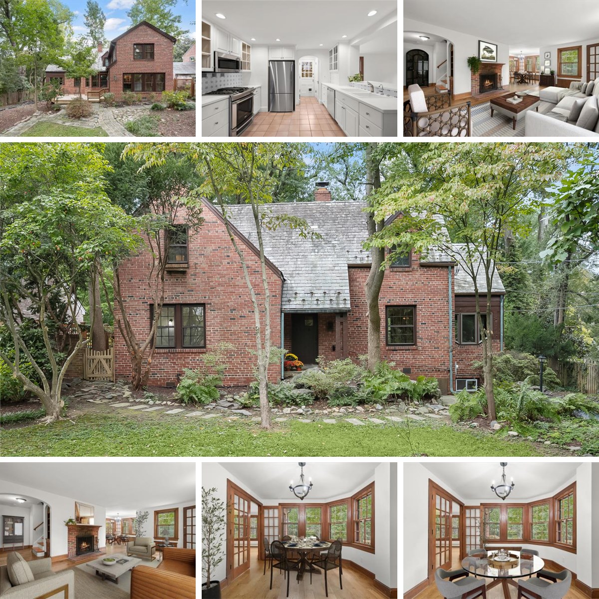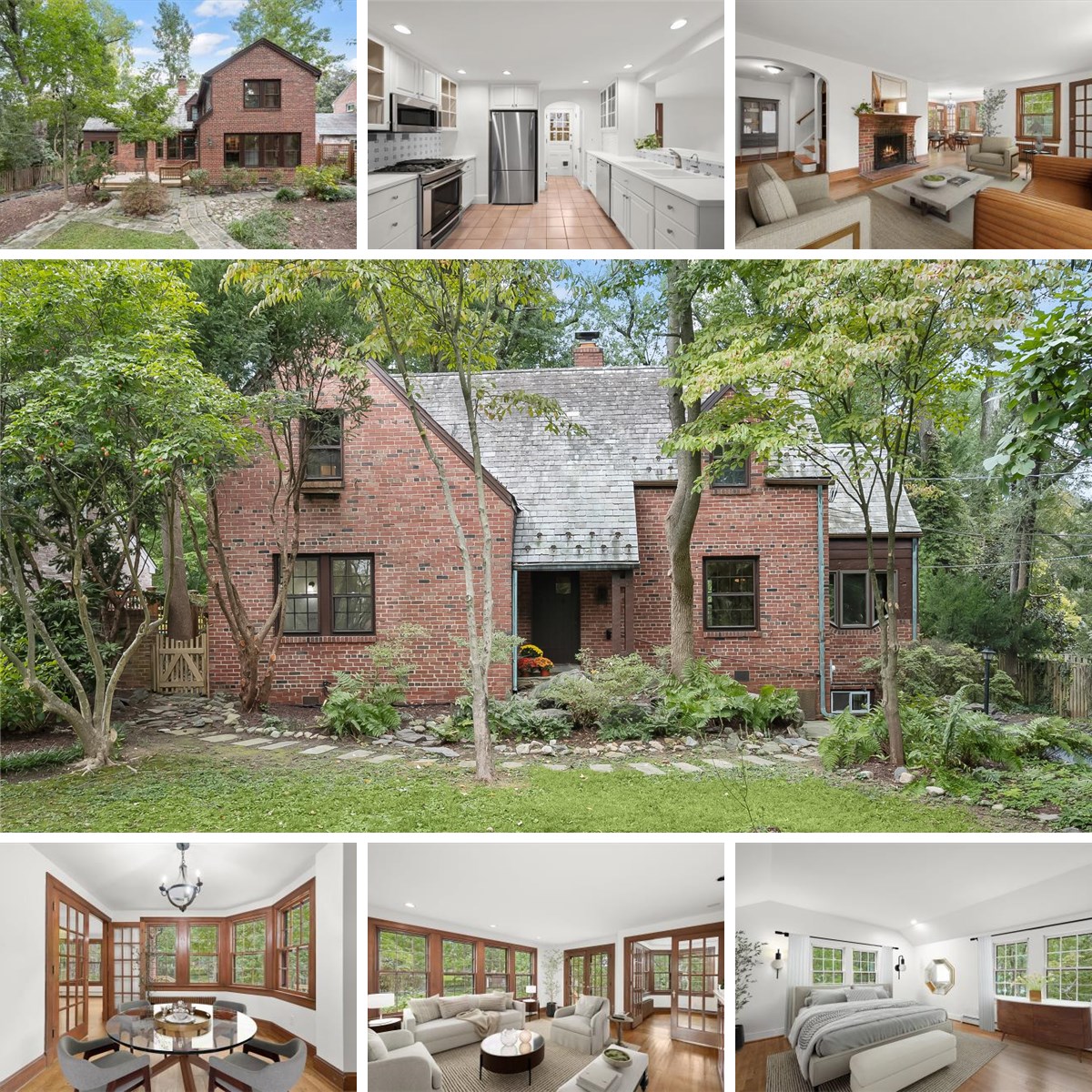 Welcome to 1010 Highland Drive, an elegant 1935 Tudor residence nestled in the prestigious Woodside Park neighborhood. This timeless home exudes classic charm and refined character, with a handsome exterior showcasing solid brick construction, a slate roof with copper accents, flagstone walkways, and an inviting deck surrounded by mature trees. Inside, exquisite architectural details abound, from wood-framed windows and built-in cabinetry to abundant closet space. The welcoming entry opens into a spacious living room anchored by a cozy fireplace and flowing seamlessly into a sunroom or office with exposed brick walls. The formal dining area provides an elegant setting for gatherings, while the kitchen is appointed with display cabinetry and stainless steel appliances. A family room off the kitchen offers peaceful views of the backyard and direct access to the deck. A main-level bedroom and full bath add flexibility for guests or a home office.