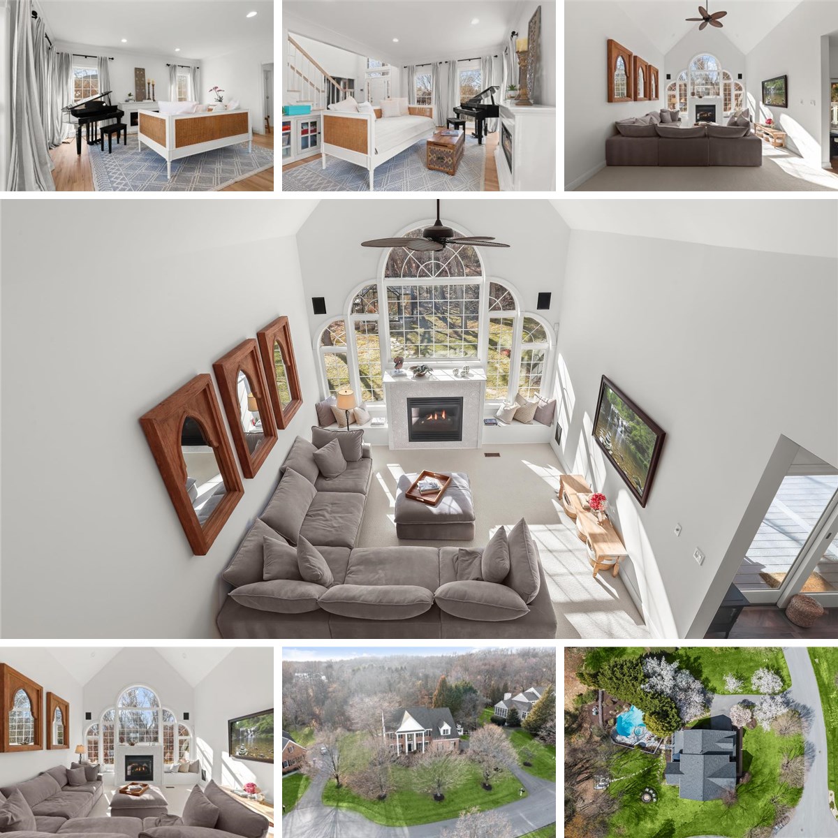 Great Room with Vaulted Ceilings, Palladian Window Wall, and Marble-Mosaic Fireplace