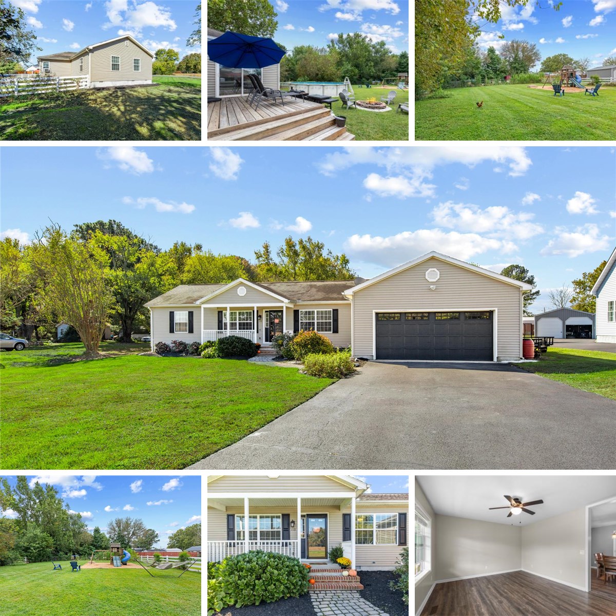 Curb appeal abounds at this inviting ranch-style home, set on over a half-acre with thoughtfully landscaped grounds and a sweeping paver walkway leading to a welcoming covered front porch. Inside, the home has been well cared for and updated, offering generous living space, three spacious bedrooms, two full bathrooms, and a separate office with its own private entrance. The front living room has been freshly painted, while the family room off the kitchen features new carpet, creating a warm and comfortable space for everyday living. The spacious kitchen is designed with functionality and style in mind, complete with room for a table, a stylish backsplash, and a convenient storage pantry. Adjacent to the main living areas, a large sunroom flows out to a deck overlooking the expansive, fully fenced backyard—perfect for outdoor entertaining. Enjoy summer fun with the included playset and above-ground swimming pool (installed in 2020, fully inspected and up to code). A two-car garage provides ample parking and storage, enhanced by a new garage door (2020). Recent updates include Pergo Max flooring, HVAC (2021), water heater (2019), new carpet, a fully encapsulated crawlspace with dehumidifier and warning gauge (2019), and driveway resealed in 2024. No HOA fees! This well-maintained home offers the ideal combination of modern updates, flexible living spaces, and outdoor amenities, truly the one you’ve been waiting for!