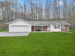 Set on seven private, wooded acres, this brick accented rancher offers a rare blend of space, comfort, and thoughtful updates, all complemented by charming curb appeal and a welcoming covered front porch. Inside, hardwood flooring begins in the living room, where a large picture window fills the space with natural light, while crown molding seamlessly carries into the adjoining dining room for a cohesive feel. The kitchen is both stylish and functional, featuring stainless steel appliances, granite countertops, and modern cabinet pulls, with easy flow into the family room highlighted by continued crown molding and a sliding glass door that opens to the backyard.