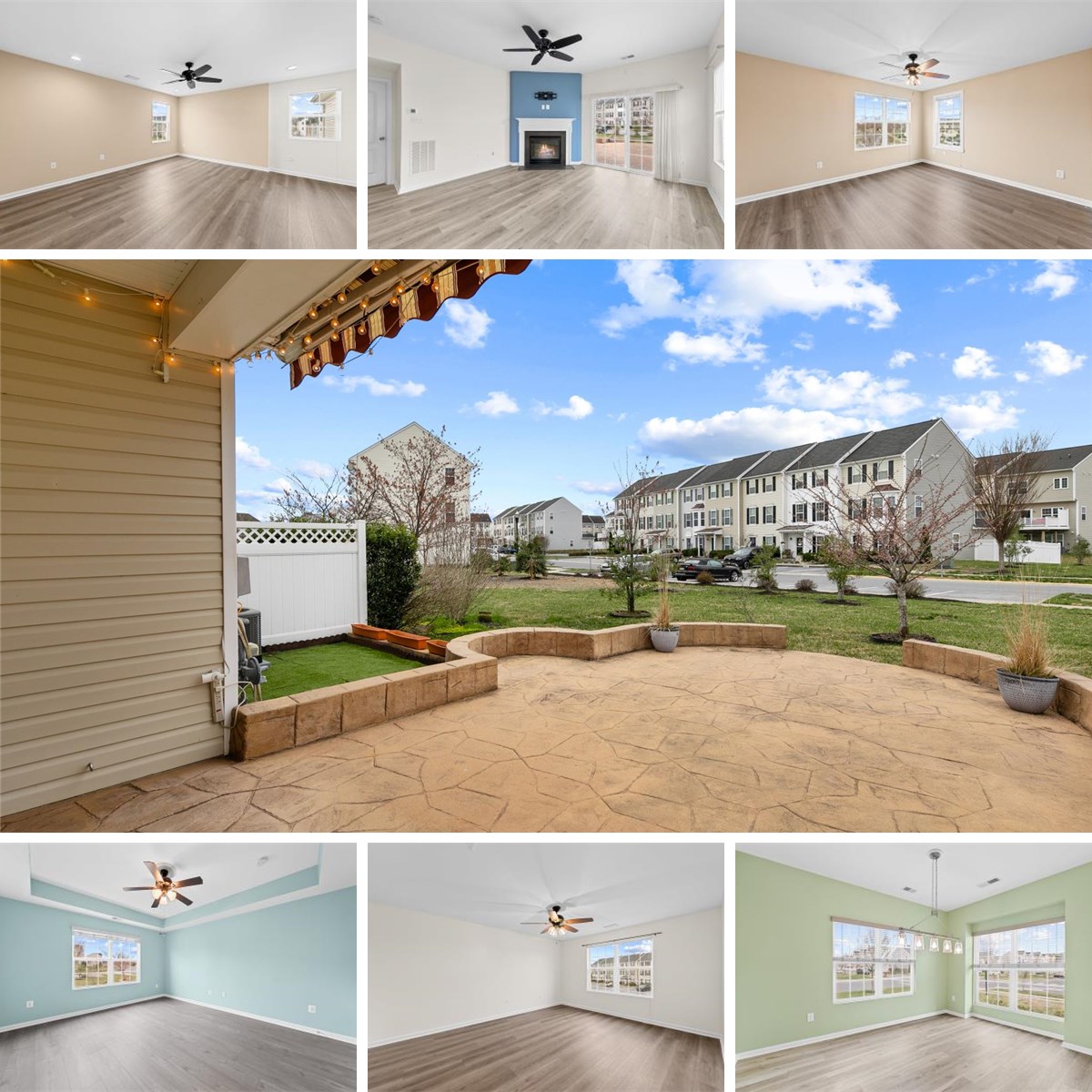 Step outside to enjoy the stamped concrete terrace, complete with a retractable awning, perfect for relaxing, entertaining, or simply taking in the unobstructed views of the open space behind the home.