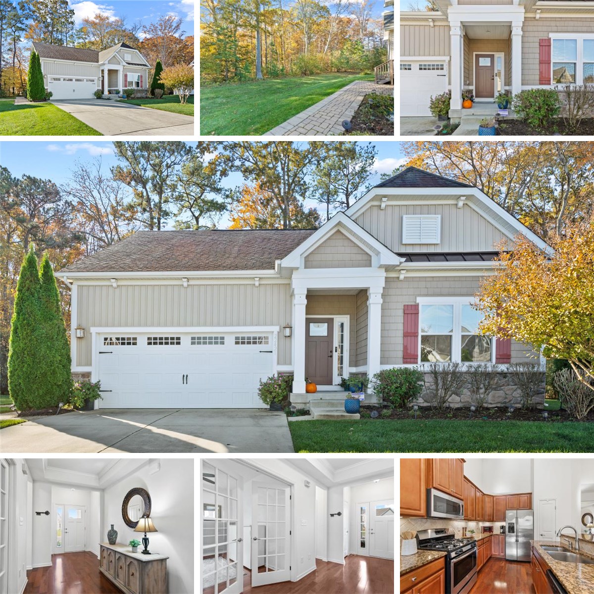 Welcome to this gorgeous stone-accented home in the quiet and friendly Oakwood Village community, where curb abounds appeal with vertical and shaker siding, multiple roof line peaks, board and batten shutters, a metal roof accent, and attractive landscaping. Backing to mature trees, this home offers the comfort of easy single-level living in an open and airy floor plan while also featuring a valuable finished lower level. A welcoming foyer introduces a neutral color palette, warm wood flooring, and decorative crown molding. The spacious great room impresses with a vaulted ceiling and a stone fireplace with mantel and flows seamlessly to a delightful dining area and a beautiful kitchen appointed with a center island with breakfast bar, granite countertops, stainless steel appliances, and gas cooking. The main-level primary suite is enhanced by a luxurious full bath with a double sink vanity and tiled stand-in shower. A home office adorned by French Doors, full hall bath and convenient laundry room complete the main level, making single-floor living effortless. The finished lower level offers a spacious third bedroom or flex space with an attached full bath for added convenience, creating the perfect area for guests or extended living needs. Additional storage on this level provides opportunity for future expansion. Thoughtful upgrades throughout include a central vacuum system, Guardian security system, and custom built-in 7-channel surround sound. A paver walkway leads you to the rear of the home, where lush trees provide a serene backdrop. Oakwood Village offers impressive amenities including a clubhouse, fitness center, in-ground pool, tennis courts, and tot lots. This is an exceptional opportunity to enjoy coastal living in a beautifully maintained home within a welcoming and well-appointed community.