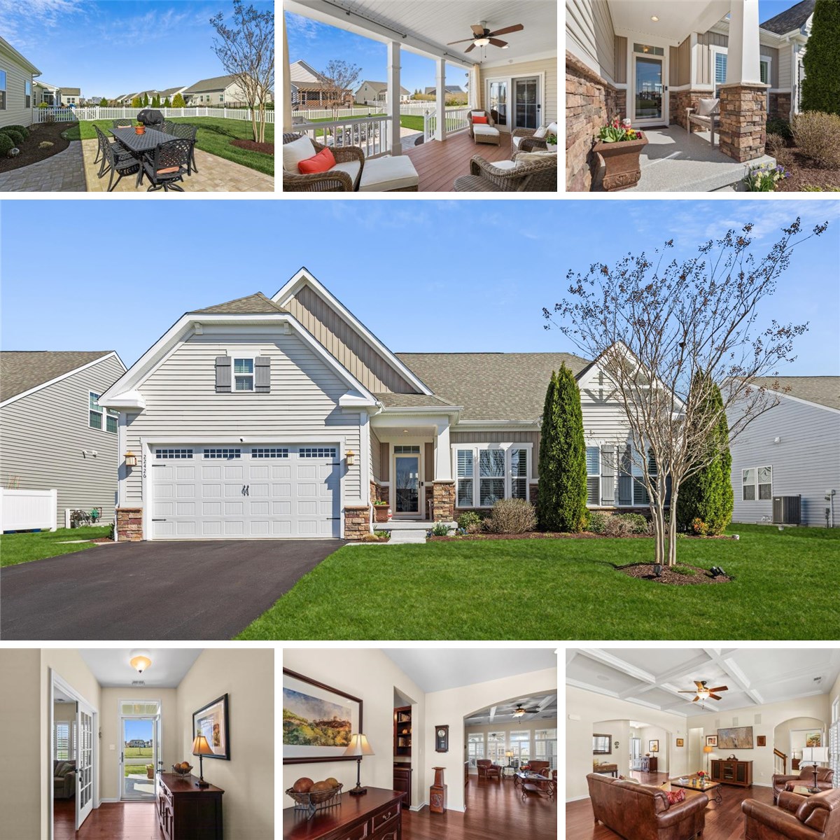 Welcome to 22426 Pelican Point Boulevard, a beautifully updated and meticulously maintained home set on a premium homesite overlooking a spacious open common area, offering added privacy and peaceful views. This well-appointed residence in the sought-after Pelican Point community features numerous upgrades, a thoughtful, easy-living design, and coastal convenience that come together effortlessly. Curb appeal abounds with an eye-catching blend of vertical and horizontal siding, stone accents, board and batten shutters, and multiple architectural peaks, all framed by professionally landscaped grounds supported by a separate irrigation well complete with an additional spigot for easy hand watering. The backyard is equally inviting, enclosed by a charming vinyl fence and designed for outdoor enjoyment with a handsome paver patio and a lovely, covered porch featuring composite decking and a ceiling fan, perfect for relaxing or entertaining. Step inside to a welcoming foyer that unfolds into an open and airy main living space, highlighted by rich engineered hardwood flooring and elegant arched doorways. A private home office sits just off the entry, adorned with French doors, creating an ideal work-from-home setting. The living room offers a refined yet comfortable atmosphere with a coffered ceiling, transom windows overlooking the backyard, and a surround sound hookup for enhanced entertaining. The spacious gourmet kitchen is both stylish and functional, featuring granite countertops, 42-inch Timberlake cabinetry, a built-in microwave, gas cooktop, range hood, double wall ovens, and a suite of stainless-steel GE Profile appliances. A pantry provides exceptional storage, while pull-out drawers add convenience. The expansive island offers additional seating and houses a double sink and dishwasher, flowing effortlessly into the dining area, where French doors lead to the covered porch for seamless indoor-outdoor living. The primary suite is a serene retreat, showcasing a tray ceiling and private French doors to the porch. The ensuite bath is thoughtfully designed with dual vanities, a walk-in shower, and a private water closet. The walk-in closet features custom California Closet built-ins, as do all closets throughout the home, ensuring exceptional organization. The main level also includes a second bedroom, a well-appointed hall bath, and a laundry room enhanced with custom cabinetry. A convenient drop zone just inside the garage entry offers built-in cabinetry and a bookcase for storage and display, while the finished garage itself includes additional California Closet systems. Upstairs, a private third bedroom with its own ensuite bath and walk-in closet provides the perfect space for guests, offering comfort and privacy. Floored attic space on this level provides additional storage space. Additional highlights include a Ring doorbell, home security system, a high-end Trane HVAC system installed approximately five years ago, featuring a dual zone heat pump with propane backup for efficient year-round comfort. On the side of the home is a convenient trash can enclosure. Residents of Pelican Point enjoy a welcoming community atmosphere with amenities designed for relaxation and recreation, all just a short drive to the charming shops and dining of Lewes and the vibrant boardwalk, beaches, and restaurants of Rehoboth Beach. This exceptional home offers the perfect blend of comfort, convenience, and coastal lifestyle.