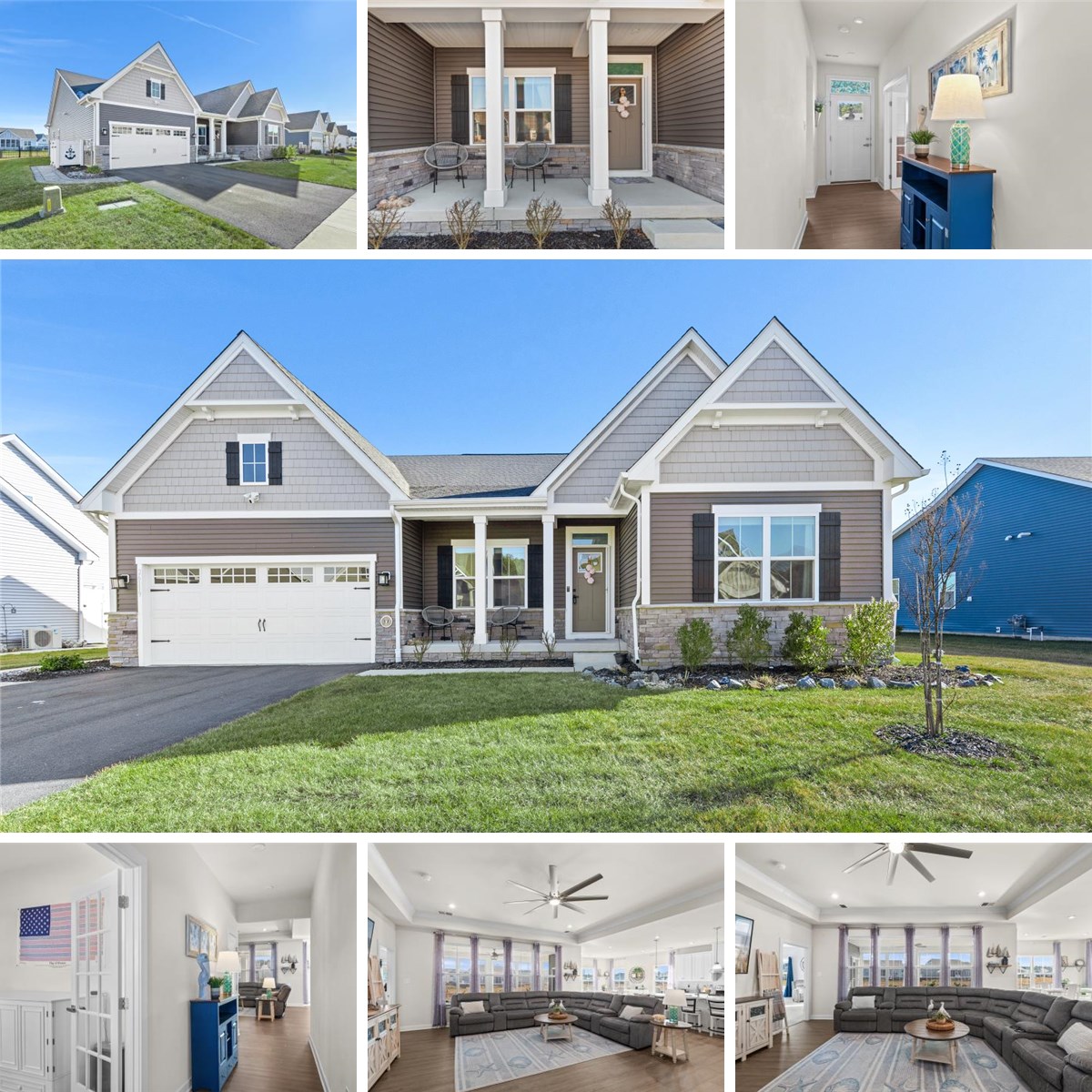 From the welcoming covered entry, step into a gracious foyer where refined craftsmanship and thoughtful design immediately set the tone. Luxury wide-plank vinyl flooring flows throughout the home, complemented by architectural details such as tray ceilings and expansive picture windows that frame peaceful pond views. The open-concept layout creates a warm, inviting atmosphere ideal for both everyday living and entertaining. The foyer, flanked by a private home office and guest bedrooms, opens seamlessly into the heart of the home, the great room. Here, a dramatic tray ceiling accented with crown molding and panoramic water views through oversized picture windows creating a stunning backdrop for gatherings with family and friends. The gourmet kitchen is a chef’s dream, featuring a spacious center island with breakfast bar seating, a classic farm sink, gleaming granite countertops, 42" custom cabinetry, and a full suite of stainless-steel appliances. A generous pantry adds both function and convenience. Just beyond, the dining area comfortably accommodates gatherings large or small and provides direct access to the expansive three-season room, an ideal spot to enjoy morning coffee or unwind with evening cocktails while soaking in the nature setting beyond. The private primary suite is a true retreat, highlighted by a deep tray ceiling, a spacious walk-in closet, and private access to the three-season room. The spa-inspired ensuite offers dual vanities separated by additional storage vanity space, a beautifully tiled shower, a second walk-in closet, and a private water closet. A desirable split-floor plan provides two well-appointed guest bedrooms with a nearby hall bath, along with a spacious laundry room and interior access to the garage, ensuring comfort and functionality throughout. Outdoors, the expansive paver patio is thoughtfully designed with areas for grilling and lounging, creating the perfect space to relax and enjoy the peaceful lakefront surroundings.