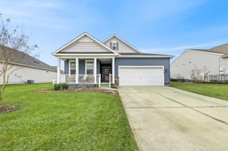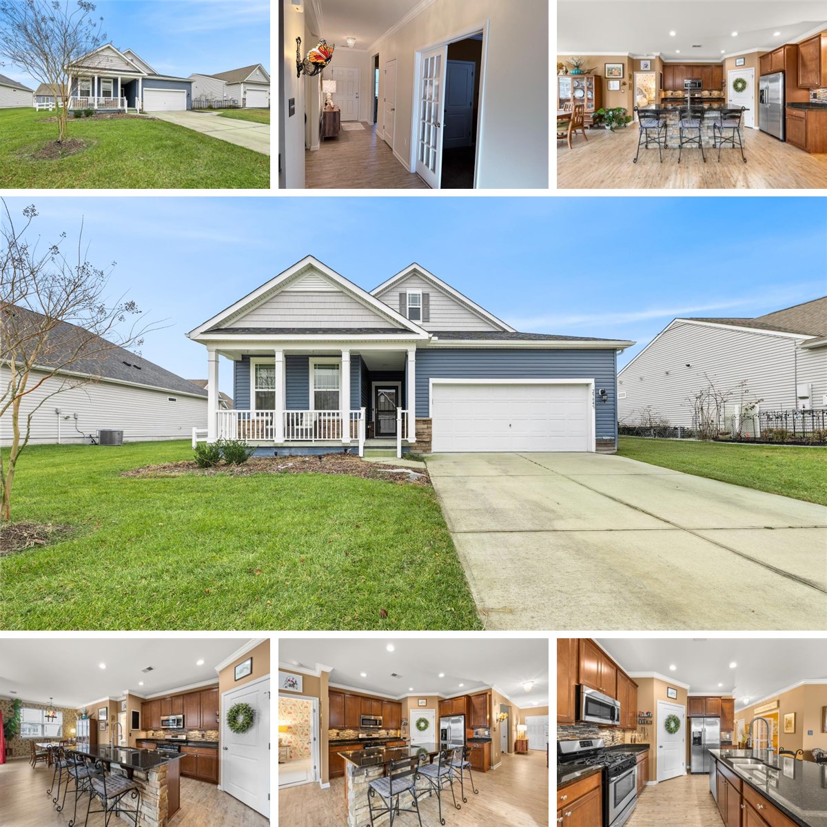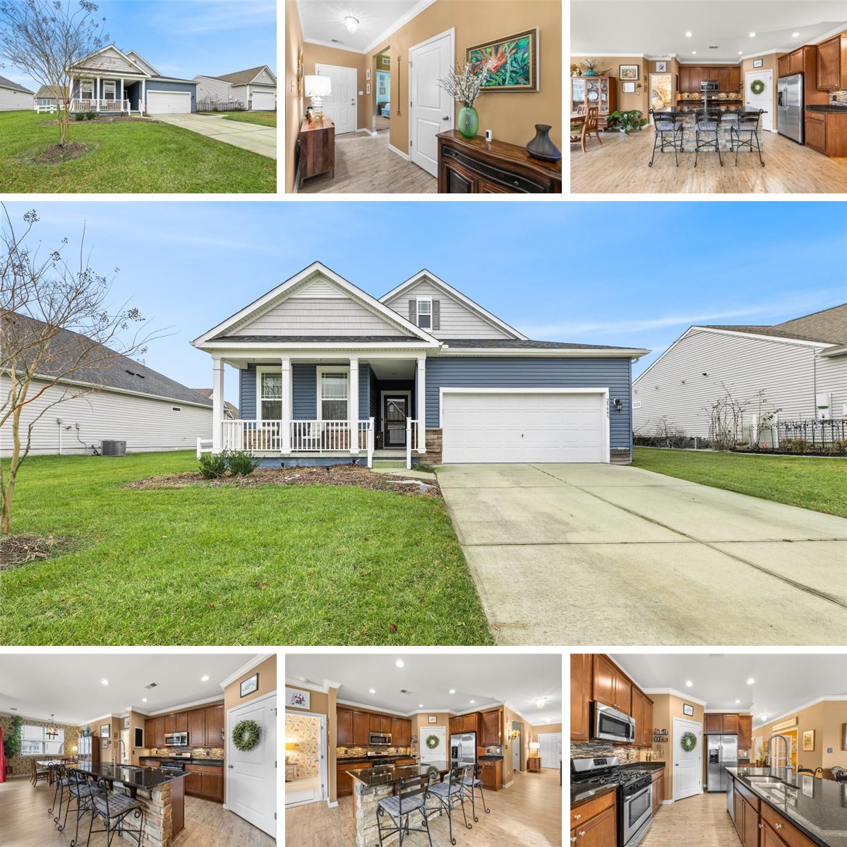 Welcome to this charming coastal cottage where refined finishes meet effortless living. A welcoming covered front porch sets the tone as you step inside to a bright, open-concept floor plan thoughtfully designed for both everyday comfort and entertaining. Elegant crown molding throughout the home adds a timeless architectural touch, enhancing the polished coastal aesthetic. The heart of the home is the beautifully appointed kitchen, featuring a striking center island with fieldstone accents, quartz countertops, a breakfast bar, recessed lighting, a pantry, warm 42-inch wood cabinetry, and sleek stainless steel appliances. The kitchen flows seamlessly into the generously sized dining area, enhanced by large windows and sliding glass doors that lead to an inviting screened porch, perfect for indoor-outdoor living.