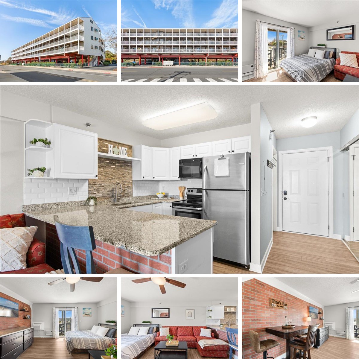 Inside, the updated kitchen shines with white cabinetry, granite countertops, and select stainless steel appliances. A stylish tile backsplash, breakfast bar, dishwasher, and garbage disposal make cooking and entertaining a breeze. Luxury vinyl flooring flows throughout the condo, tying the space together and providing a modern, easy-to-maintain foundation for both living and rental use. The living space is thoughtfully designed to accommodate a bed, sofa, and a small dining setup, while a unique faux brick wall adds a charming, coastal-industrial touch to the studio’s personality. Slider doors open to a private balcony, the perfect spot to enjoy morning coffee, evening cocktails, or just watch the world go by.
