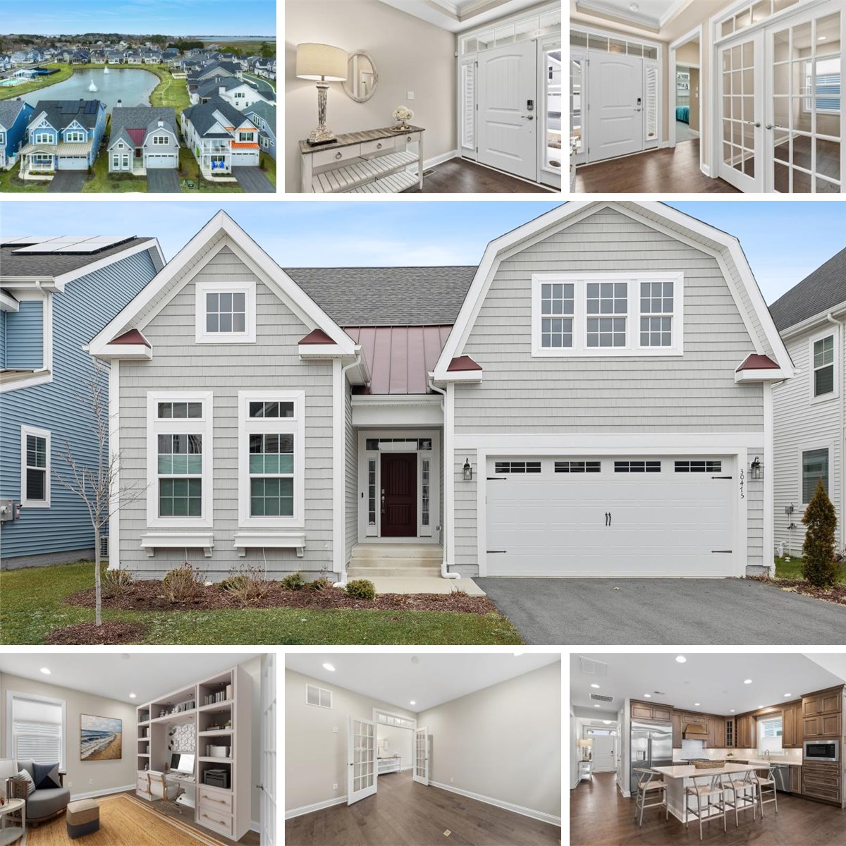 Welcome to refined coastal living in the highly desirable community of Marlin's Chase, a picturesque enclave of charming Craftsman-style homes built by the renowned Shell Brothers. Nestled on Delaware’s Eastern Shore, this exceptional three-bedroom, three-bath residence embodies elevated design, timeless architecture, and the relaxed sophistication of life near the water. From the moment you arrive, the home’s inviting curb appeal and thoughtful detailing set the tone for what awaits inside. Step through the welcoming entryway, where your eye is immediately drawn to elegant French doors opening into a private study, ideal as a home office, library, or quiet retreat. Transom and celestial windows flood the interior with natural light, enhancing the airy coastal aesthetic and highlighting the gorgeous luxury vinyl plank flooring that flows seamlessly throughout the main living areas. Recessed lighting adds a warm, refined glow at every turn. A spacious two-car garage adds everyday convenience and ample storage, perfectly complementing the home’s thoughtful design. At the heart of the home, a stunning great room offers the perfect setting for gathering and entertaining. Anchored by a beautiful, oversized fireplace and framed by views of the screened porch and patio beyond, this expansive space blends comfort with sophistication. The adjoining dining area creates effortless flow for both intimate dinners and lively celebrations. The show-stopping gourmet kitchen is designed to impress even the most discerning buyer. Marble countertops gleam beneath under-cabinet lighting, complementing warm wood cabinetry complete with display cabinets and convenient pull-out drawers. A massive center island with a breakfast bar invites casual dining and conversation, while the extra-large six-burner gas range, topped with a custom hood crafted from matching cabinetry, makes a striking focal point and a true chef’s delight. Privately tucked away, the owner’s suite overlooks the serene neighborhood pond, offering peaceful views and a luxurious escape at day’s end. Dual walk-in closets provide generous storage, while the spa-inspired en-suite bath features dual vanities, a soaking tub, and a spacious walk-in shower. The second bedroom enjoys the comfort and privacy of its own en-suite bath, and the third bedroom is conveniently served by a beautifully appointed full hall bath, ideal for guests.