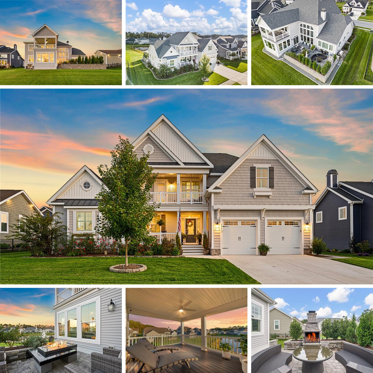 This elegant Schell Brothers Chesapeake residence showcases timeless architecture, refined details, and grand indoor-outdoor living with captivating pond views. Offering 5 bedrooms, 5 full baths, and three levels of robust living space, this home is as impressive in scale as it is in design. The finished basement immediately sets this home apart, featuring a private home gym, media room with projection screen and theater seating, rustic wine room with full-sized wine refrigerator, spacious recreation area, full bath, and even a professional salon, an extraordinary level blending leisure, style, and convenience. Curb appeal abounds with manicured landscaping, multiple roof peaks, board-and-batten shutters, a covered front porch with composite decking, and a charming pergola above the garage. At the rear of the home, extensive hardscaping creates a luxurious retreat overlooking the tranquil pond. A two-tiered paver patio highlights a dramatic wood-burning fireplace, 65-inch Enfield propane fire pit, and Lynx professional grill, with raised garden beds adding a touch of charm. Designed for both elegant entertaining and quiet evenings, this outdoor haven is truly spectacular. A transom front door with sidelights opens to an inviting foyer, where French transom doors lead to a private home office. Plantation shutters, custom blinds, and designer window treatments add sophistication throughout. The gourmet kitchen is a showpiece, anchored by an expansive quartz island and appointed with Viking appliances, a five-burner gas cooktop with range hood and pot filler, built-in oven, 42-inch display cabinetry with accent lighting, soft-close cabinets with underlighting, and a custom walk-in pantry with built-in spice storage. A deep stainless farmhouse sink with arched faucet completes the design. The adjoining dining area and sunroom with bamboo shades flow seamlessly to the grand outdoor living spaces. The great room makes a lasting impression with soaring ceilings and a dramatic two-story wall of windows showcasing serene pond views. Custom built-ins with integrated lighting flank the gas fireplace, creating an elegant focal point. The spacious main-level primary suite offers a tranquil sitting area with tray ceiling, dual walk-in closets, and a spa-inspired en suite with dual vanities, soaking tub, walk-in shower with bench, and private water closet. A second bedroom and full bath provide convenience. The laundry room doubles as a butler’s pantry with Energy Star appliances, built-in cabinetry, and utility sink. The garage features epoxy flooring, built-in storage, and an additional refrigerator. Upstairs, a versatile loft serves as a hub for three spacious bedrooms. Two enjoy en suite baths, while one offers a private balcony and expansive walk-in closet. A fifth bedroom, currently styled as a sophisticated home office retreat, features custom built-ins, a crisp shiplap ceiling, and rich navy walls, creating a refined coastal vibe. The loft itself opens to a covered balcony with ceiling fans and sweeping pond views. Every element of this home reflects elegant design, timeless finishes, and spacious comfort, with refined living space and picturesque pond views as the backdrop to everyday living. Select furnishings will convey with the sale