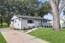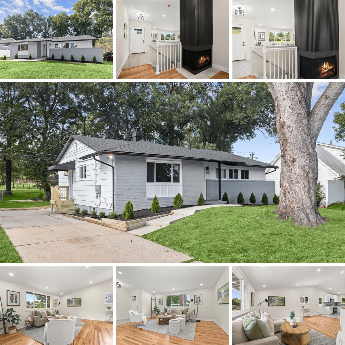 Introducing this fully renovated home offering five bedrooms and three full bathrooms across two finished levels of thoughtfully designed living space. Updated throughout, it showcases modern finishes paired with a neutral color palette. The open-concept main level boasts a cathedral ceiling, recessed lighting, hardwood floors, and abundant natural light. The front living room welcomes you with built-in cabinetry for extra storage, while the dining room is highlighted by a wood-burning