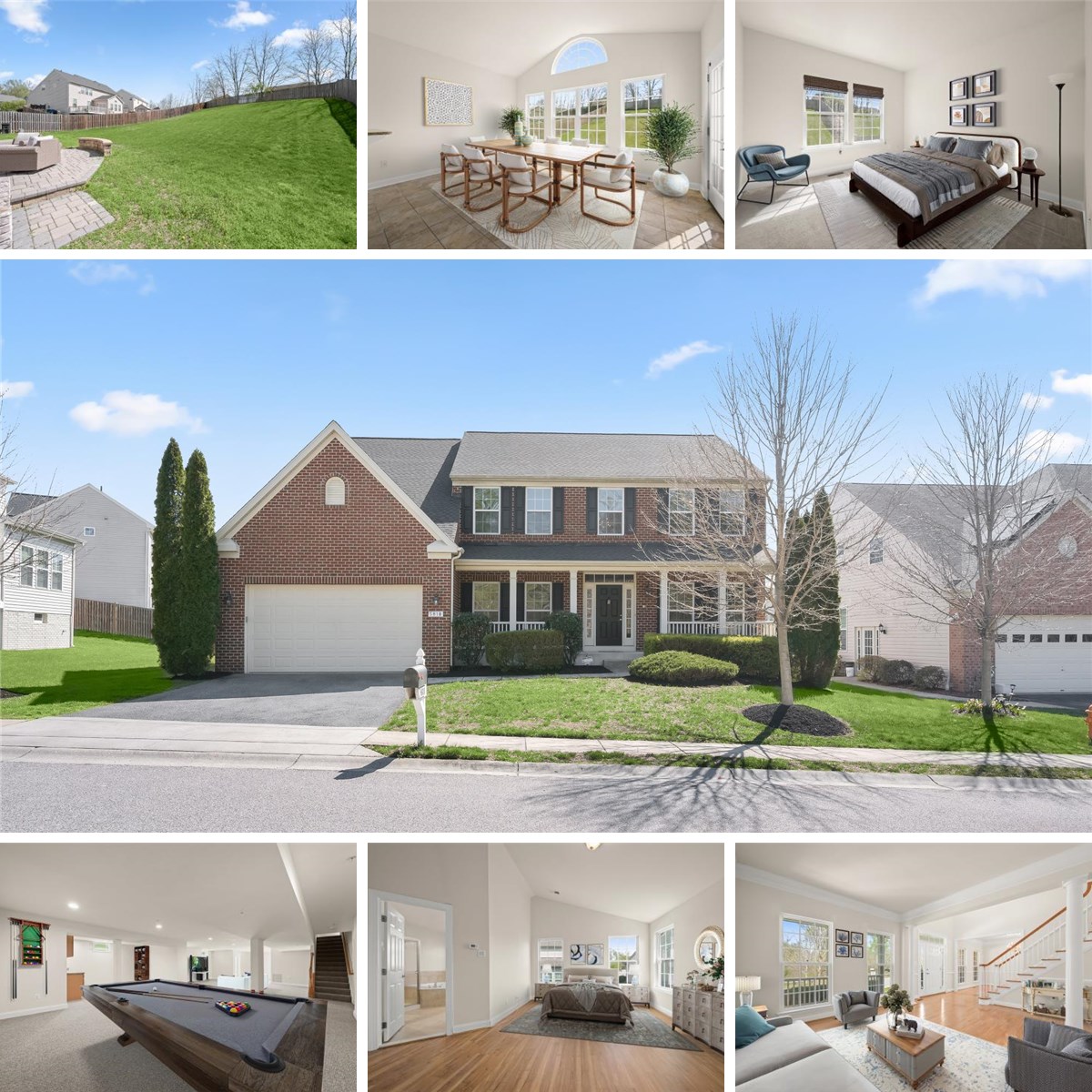 Beautiful 5-bedroom, 5 full bath Colonial located on a premium lot in sought-after Claremont Estates community, offering over 5,000 sq. ft. of luxurious living space with refined design and timeless elegance throughout. A dramatic two-story foyer welcomes you, flanked by formal living and dining rooms adorned with gleaming hardwood flooring and detailed accent molding. The spacious family room with surround sound speakers, is framed by architectural columns, and flows effortlessly into the gourmet kitchen, with large walk-in pantry features granite countertops, an oversized island breakfast bar, stainless steel appliances, and a bright, airy morning room with a soaring vaulted ceiling and direct access to the patio, perfect for everyday living and entertaining alike. A main-level private office / bedroom, full bathroom, and laundry room with pull out table provide exceptional flexibility. Upstairs, the luxurious primary suite offers a serene sitting room, two walk-in California closets, and a spa-inspired en suite bath with a jetted tub, separate shower, and dual vanity. A second bedroom enjoys its own private full bath, while two additional bedrooms share a dual-entry full bathroom. Beautiful new LVP flooring extends throughout the upper level. The finished lower level is designed for recreation and relaxation, complete with a custom wet bar, a media room with built-in speakers, a full bathroom, and abundant storage. Outdoors, an expansive paver patio with retractable awning, overlooks the fenced, landscaped yard, an ideal setting for gatherings or quiet retreat. Recent updates include the roof (2025), water heater, refrigerator, flooring, fresh paint, and more, adding peace of mind and modern appeal.
