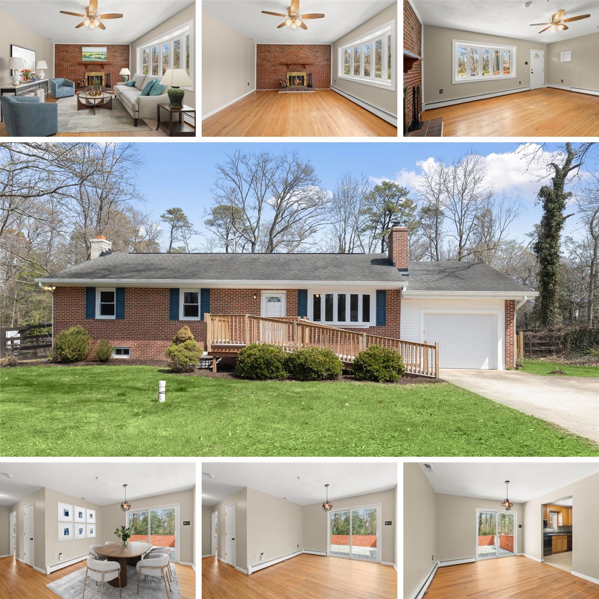 Freshly painted in a neutral color palette and accented by hardwood flooring throughout much of the home, the interior feels bright, cohesive, and move-in ready. Renovated bathrooms and a new water heater add peace of mind, while thoughtful updates enhance both style and function. The living room welcomes you with a striking brick accent wall, a cozy fireplace, and a sunlit bay window that fills the space with natural light.