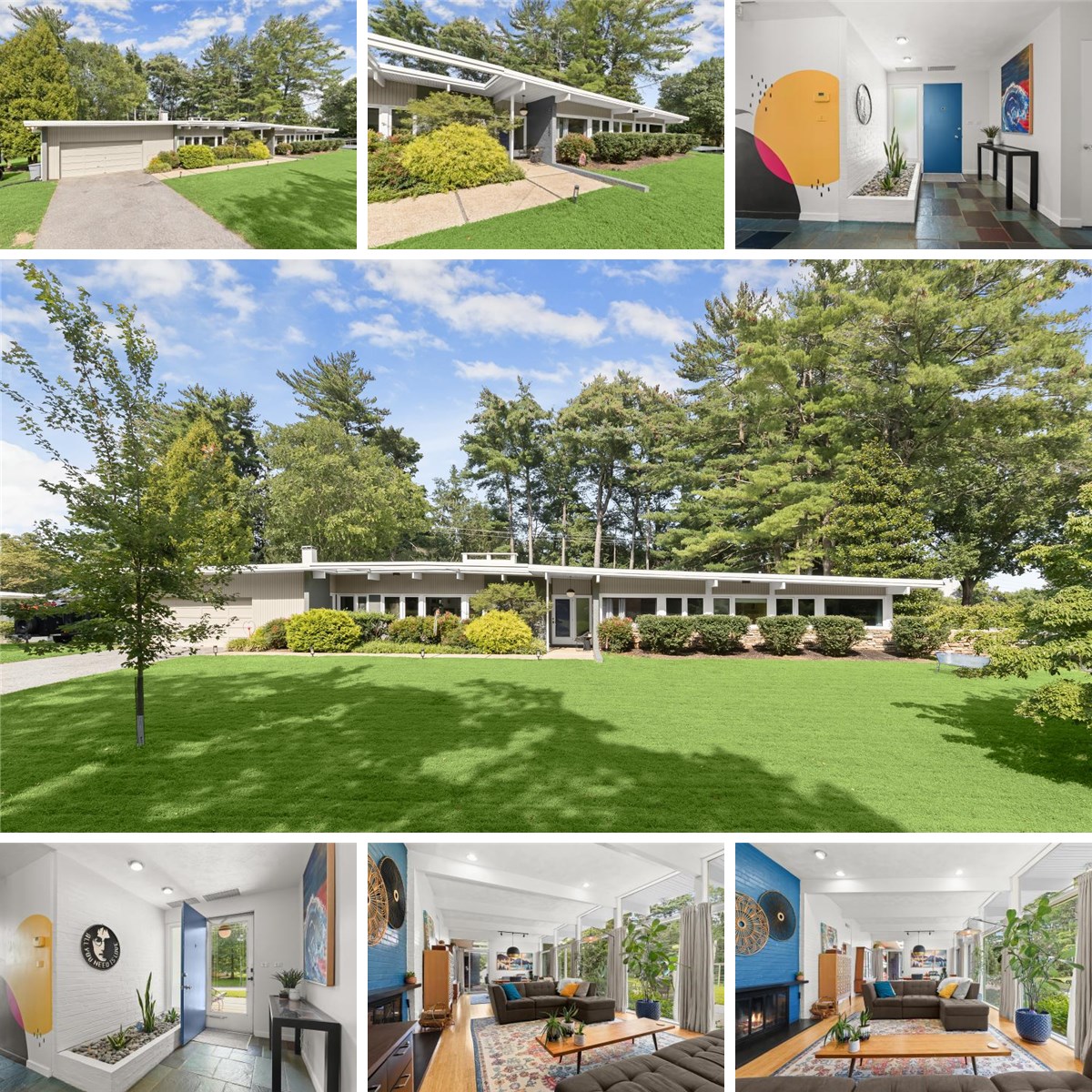 Welcome to this stunning Mid-Century Modern home designed and built by Gordon Sugar in the sought-after Stevenson, offering exceptional one-level living with four bedrooms and two-and-a-half bathrooms. Tucked away in a quiet cul-de-sac on a half-acre lot backing to trees, this home’s peaceful setting provides a true retreat. Discover the warmth and charm of this inviting residence filled with natural light, where tall vaulted ceilings, brick walls, and slate and hardwood floors highlight its authentic 1950s craftsmanship. The impressive open-concept living and dining rooms are filled with natural light from floor-to-ceiling windows and sliding glass doors that open to the backyard, anchored by a cozy wood-burning fireplace. A spacious eat-in kitchen includes a breakfast nook perfect for casual meals. Completing this side of the home are a laundry room, half bathroom, and access to the two-car garage. On the opposite wing, the primary bedroom features a walk-in closet and a private ensuite bathroom with a walk-in shower. The second bedroom is a versatile space with sliding built-in cabinets that open to the living room, making it ideal as a den or office. Two additional bedrooms and a shared full hall bathroom with a tub-shower complete the layout. Outside, enjoy the expansive backyard with a large patio and plenty of room for gatherings. An outdoor storage closet holds everyday essentials, while a large underground fallout shelter offers additional flexibility and can be utilized for storage.