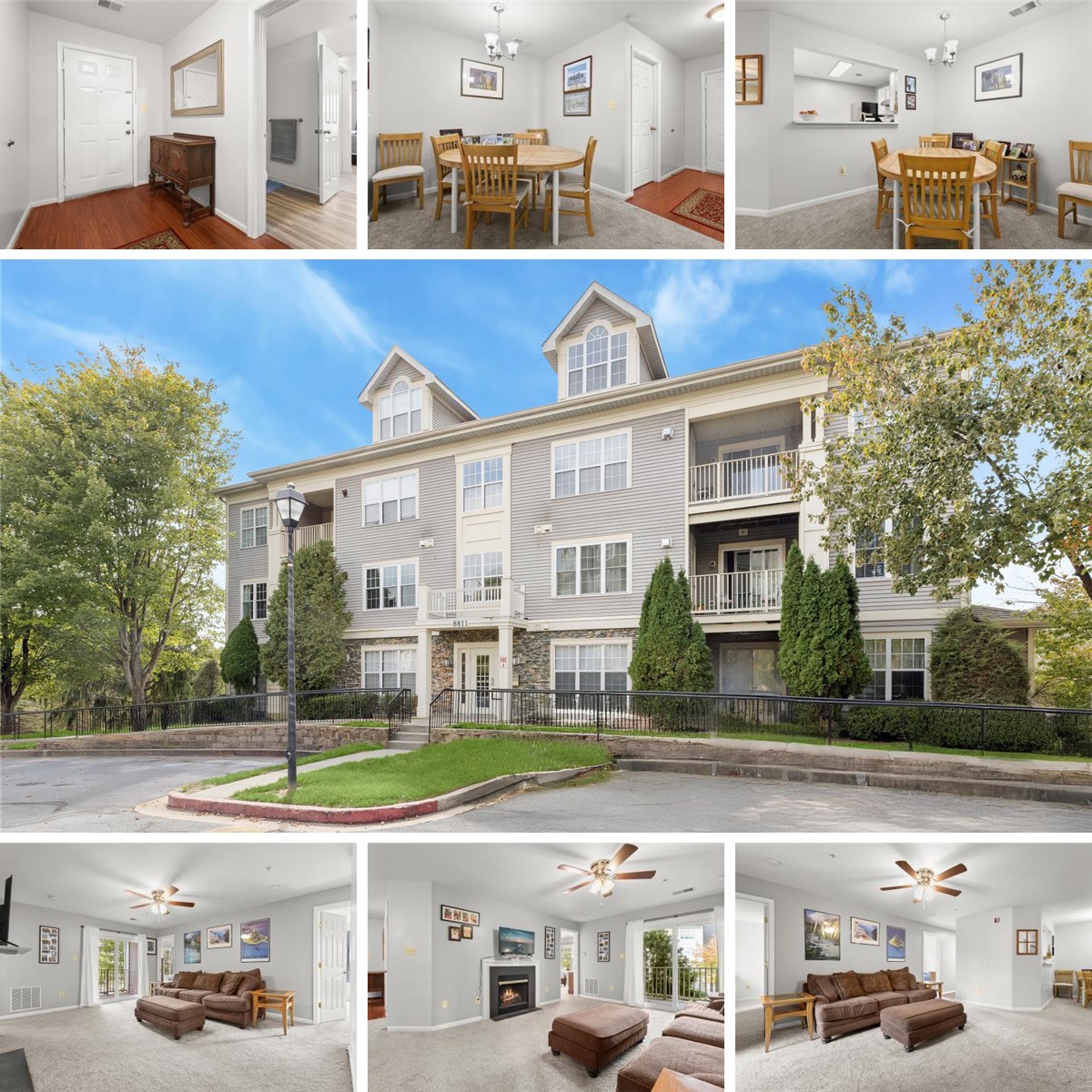 Three bedrooms and two full bathrooms await in this spacious second-floor condo in Stone Ridge, offering over 1,200 square feet of comfortable living space. A neutral color palette and plush carpeting create a welcoming atmosphere, complemented by modern luxury vinyl plank flooring in the kitchen and bathrooms. The kitchen showcases stainless steel appliances and quartz countertops, with a separate dining area for enjoying meals. A gas fireplace anchors the living room and sliding glass doors open to the private balcony for relaxing outside. The primary bedroom features two closets, including a walk-in, along with an ensuite bathroom with a tub shower. Two additional bedrooms share a connecting full bathroom with a glass-enclosed walk-in shower, and a dedicated laundry room adds convenience with extra storage.